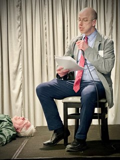 Former Chief Justice of KS Supreme Court Lawton Nuss leading skit on historic role of veterans' courts, fall 2023
